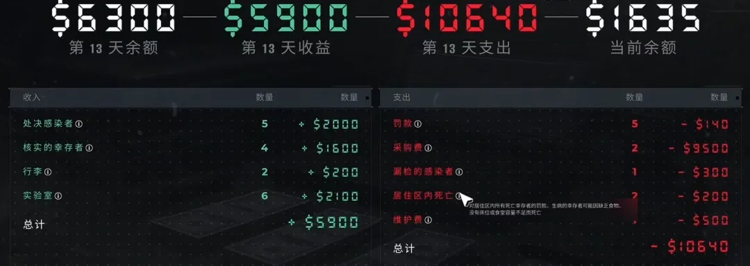 随着游戏推进,更多的幸存者前来也需要金钱来进行基地的扩容、检疫区扩建等。所以只要你不小心放进一只丧尸,你就可以等着第二天醒过来看到它在营地带走几条人命和你的上万块钱罚款。