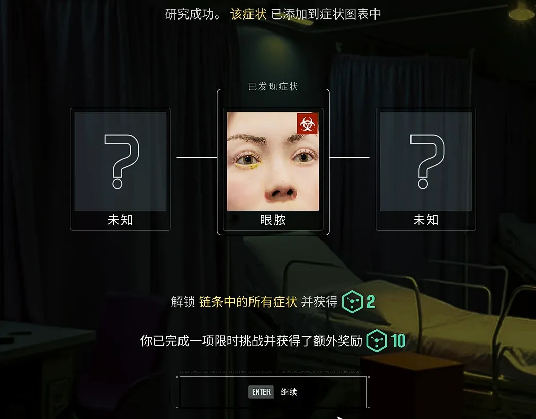 除了系统已经明确给定的几种症状之外,游戏还别出心裁地制作了需要玩家自行研究探索的未知病症,玩家需要在研究院中投入对应的幸存者,亲自采集症状部位进行研究,去获取对应的症状表现。