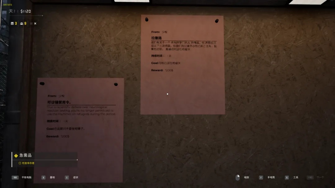 虽然说起来很容易,只要看好每个症状就行了,但游戏中存在着任务系统,有时会出现任务限制你某些工具的使用。所以是为了赚取任务给的奖励,还是冒着风险让缺失检查项目的幸存者进入营地?这就需要玩家自己来做决策了。