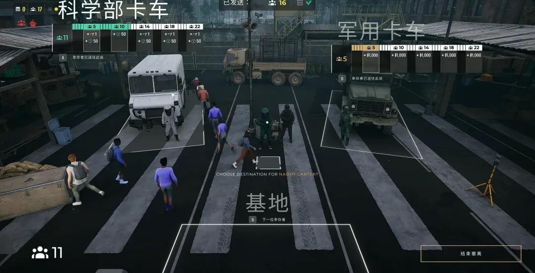 这些金钱的来源,除了检查工作中辨认无感染者和处决感染者给的奖励之外,每5天你就需要疏散幸存者到安全军区,来换取对应的研究点数或是金钱奖励。如果你的疏散人数不能满足军区的需求,那么也会导致游戏失败。