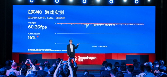 可以说,第五代骁龙8的GPU基本上就是冲着“高能且持久”的高能效方向设计的,因此也更适合那些有着长时间游戏需求的玩家。在发布会上,高通也公布了实际的游戏测试数据,在典型3D大作《原神》中,最高画质下仍然可以实现平均60.39 FPS的满帧运行,而且帧率波动更小、功耗比竞品低了约 16%。