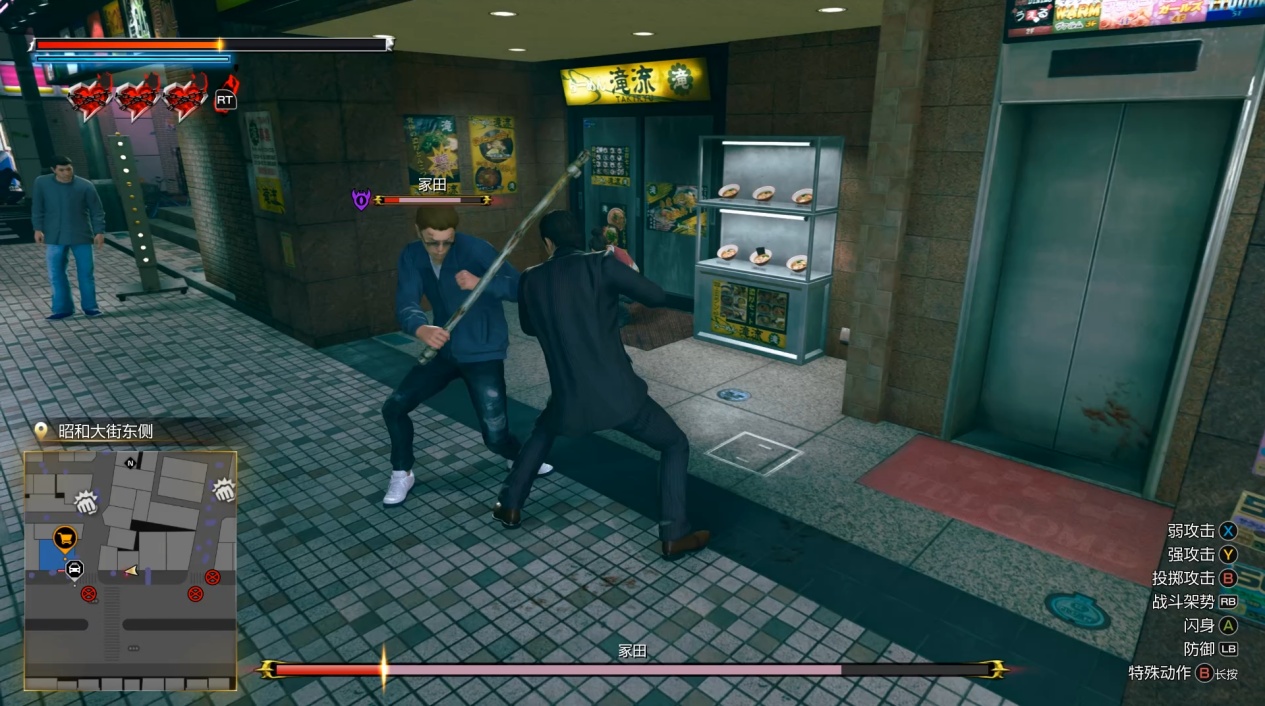 而外传的战斗系统,基本逻辑和本篇几乎一样,桐生一马的怒气量表被替换成了“黑化值”,长按RT键,峰义孝就会进入黑化、甚至2倍黑化状态,自带霸体,攻击力也大大提高。唯一一个体验上比较不同的点可能是战斗风格,峰义孝以腿功见长,招式大开大合,敏捷度拉满,他的投技是踩人起飞,后续能派生出三四种张力十足的招式,打起来非常爽快。