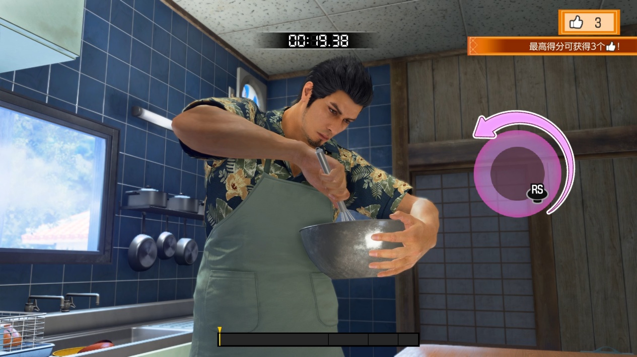首先,玩家终于不用忍受牵牛花孤儿院那长达三章的裹脚布任务,以及反派的计划刚浮出水面,桐生转手回家就开始哄孩子的割裂感了,在《如龙极3》里,制作组把这部分删的一干二净(包括流程前期和从神室町回到冲绳后的部分)。取而代之的是答题、捕鱼、做饭、种地等小游戏构成的一套模拟经营玩法,玩家需要在游戏里不断积累“好爸爸等级”,完成社区订单,让孤儿院做大做强。